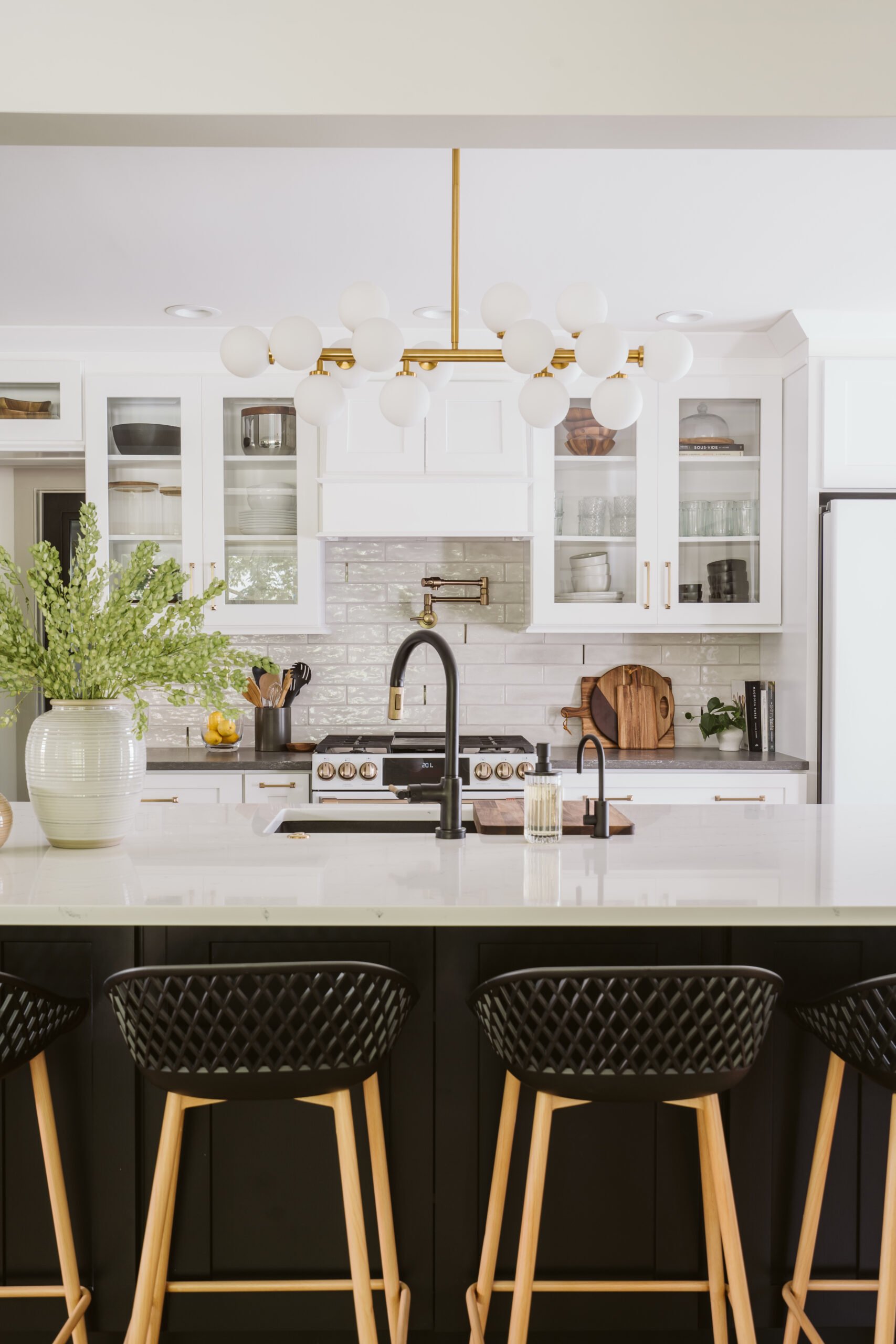 To create a space that feels cohesive we recommend picking a color palette that will compliment the color of your kitchen cabinets. You can do this by making a list of cohesive colors and narrowing it down based on what’s working well together. You can also reference the other decor items in your space to help get you started (example: color of the light fixtures, the dining chairs, the rugs, etc.). A good rule of thumb is to choose 2-3 colors and pair them with materials like glass, wood, or metal. In the featured images we chose white and black as the main colors paired with glass and wood to add warmth and dimension.