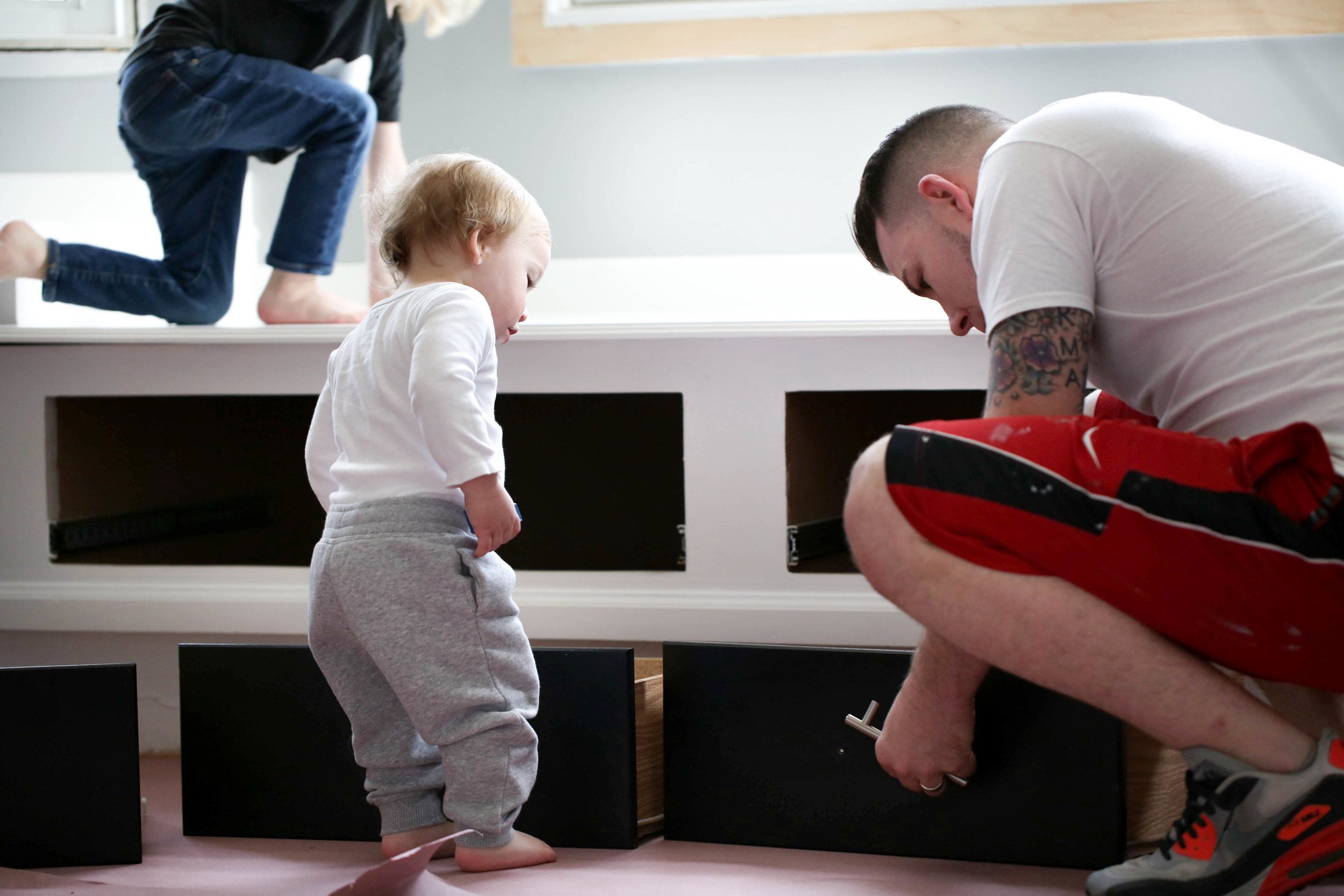 Once all the sub-flooring was installed we ran into a new problem - only 6 of our 26 boxes of hardwood flooring came in ?. Our flooring was now behind by 2 weeks!!! We had to take a pause on the flooring and move on to the built-in. We both love the look of our built-in but the functionality was just not there. Every time you open one drawer you would have to open another drawer or push the drawer to the side with your hip and some drawers had to have two or three drawers open part way to even get into there. Not to mention it was a serious workout every time you wanted to open a drawer at all. It just wasn’t constructed well at all…but Michael was handling all of that.